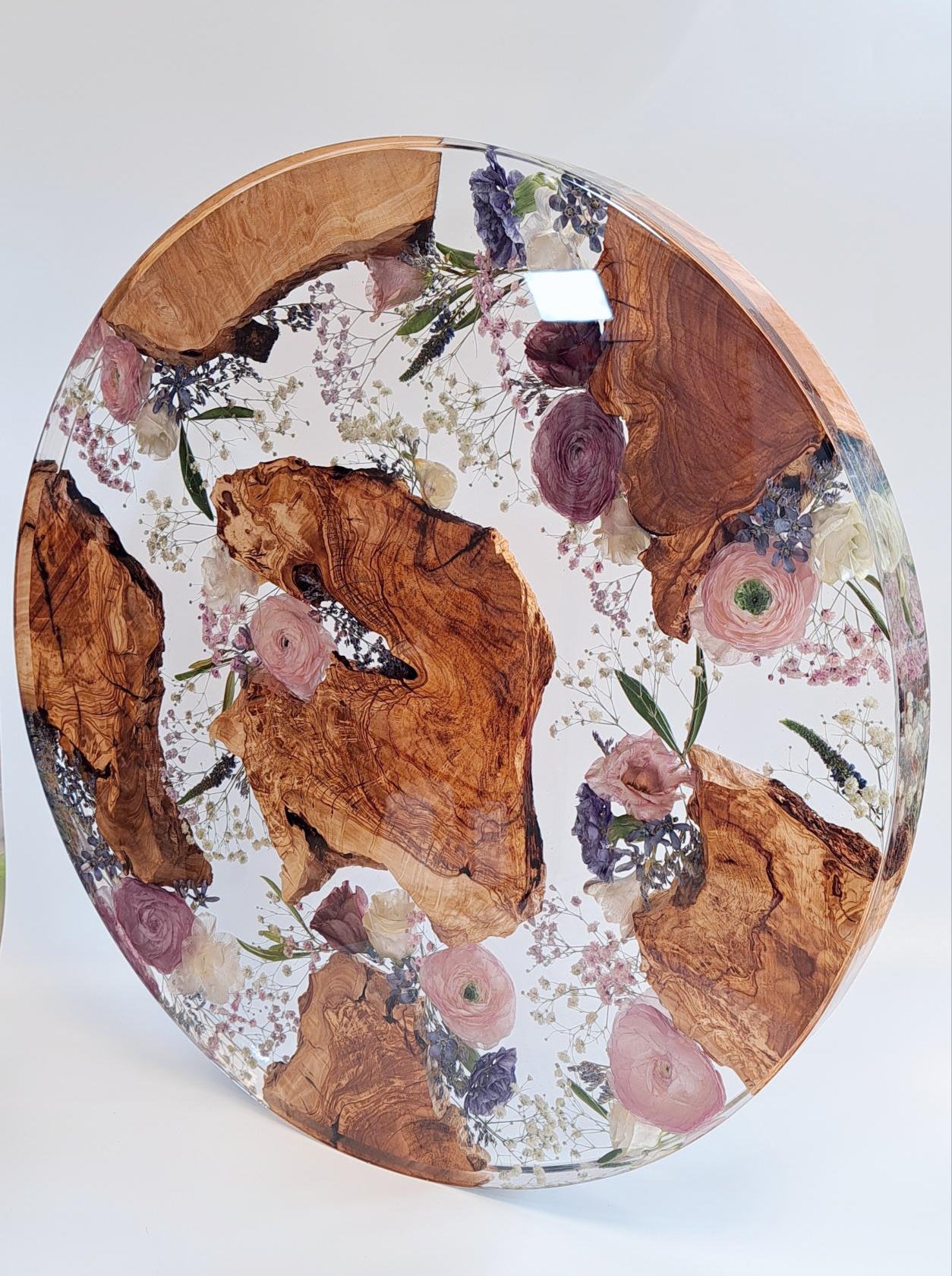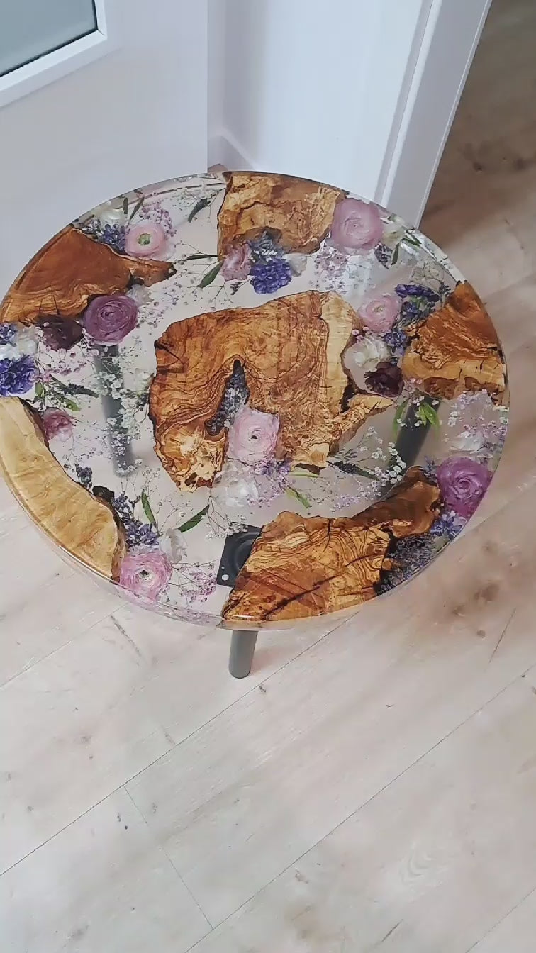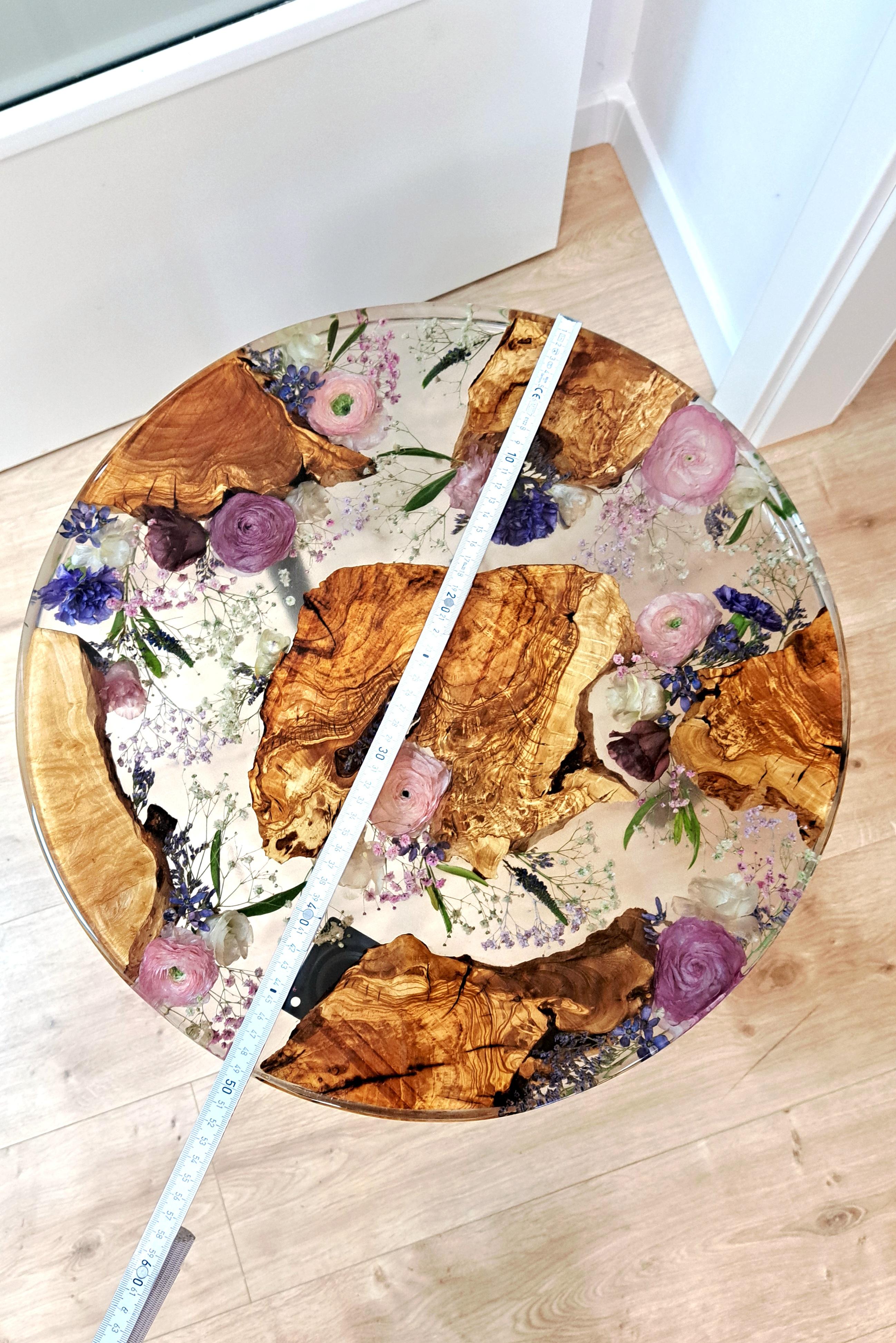 Wunderschöner Beistell-Tisch, in den die getrockneten Blumen eingearbeitet werden, Auf Wunsch können die Blumen mit Olivenholz kombiniert werden. Tischbein-Höhe 40 cm. Dauer bis zur Fertigstellung: ca. 5-6 Monate ab Eingang der Blumen bei uns.