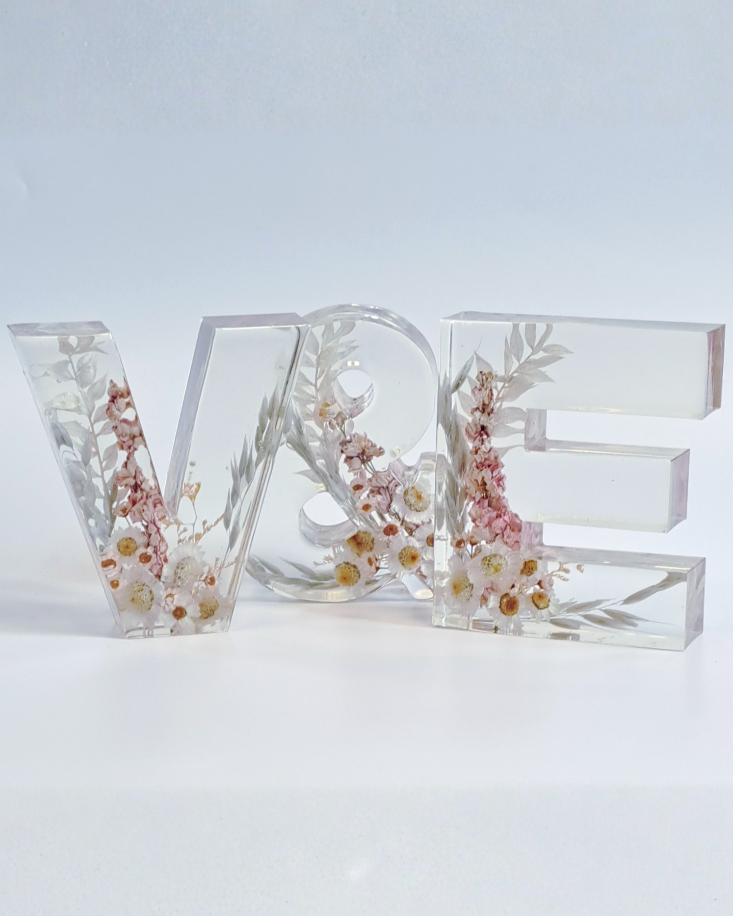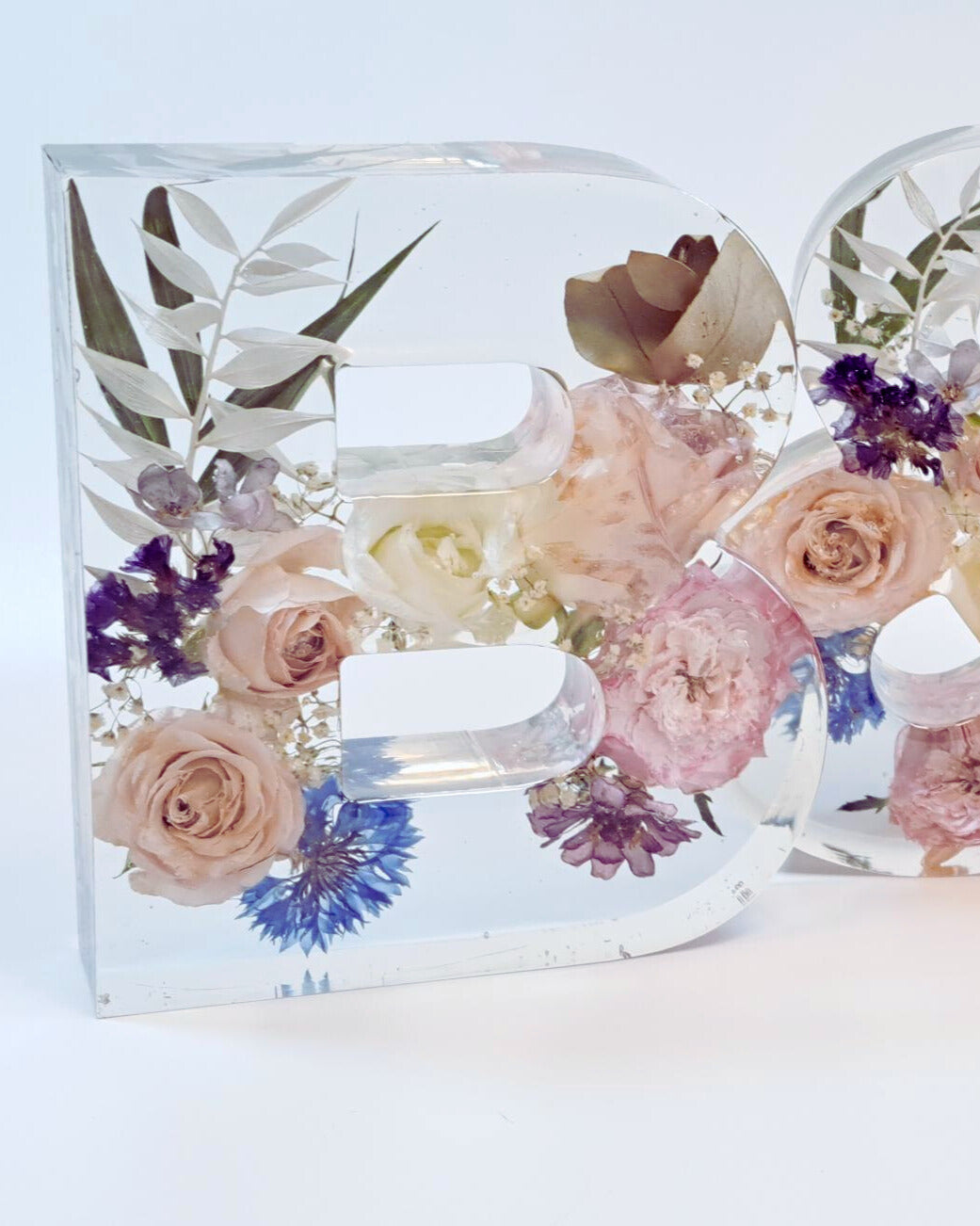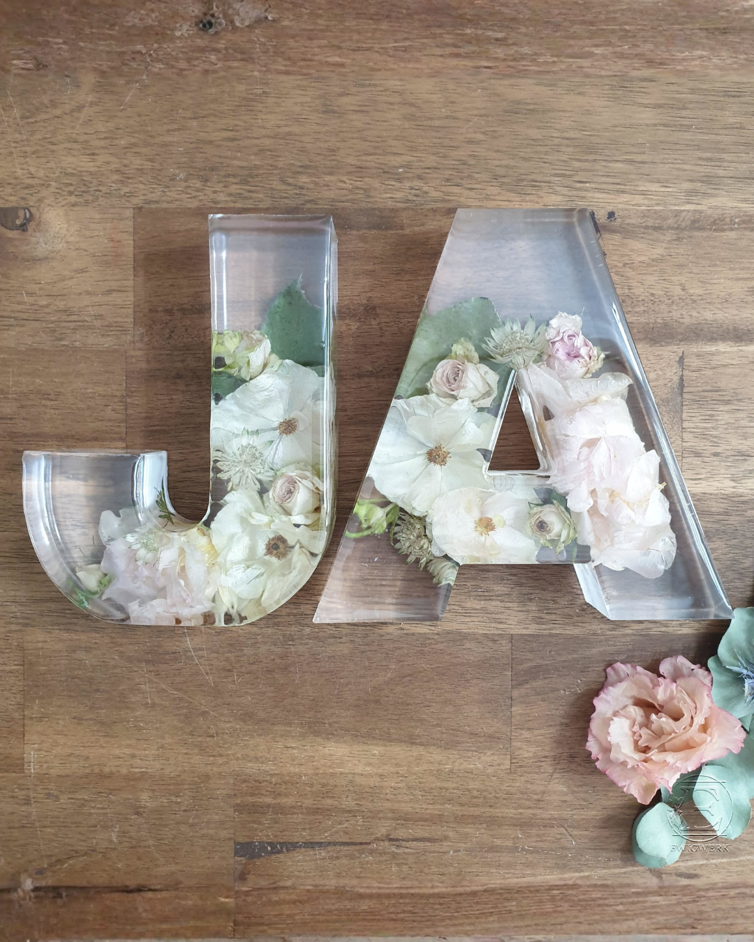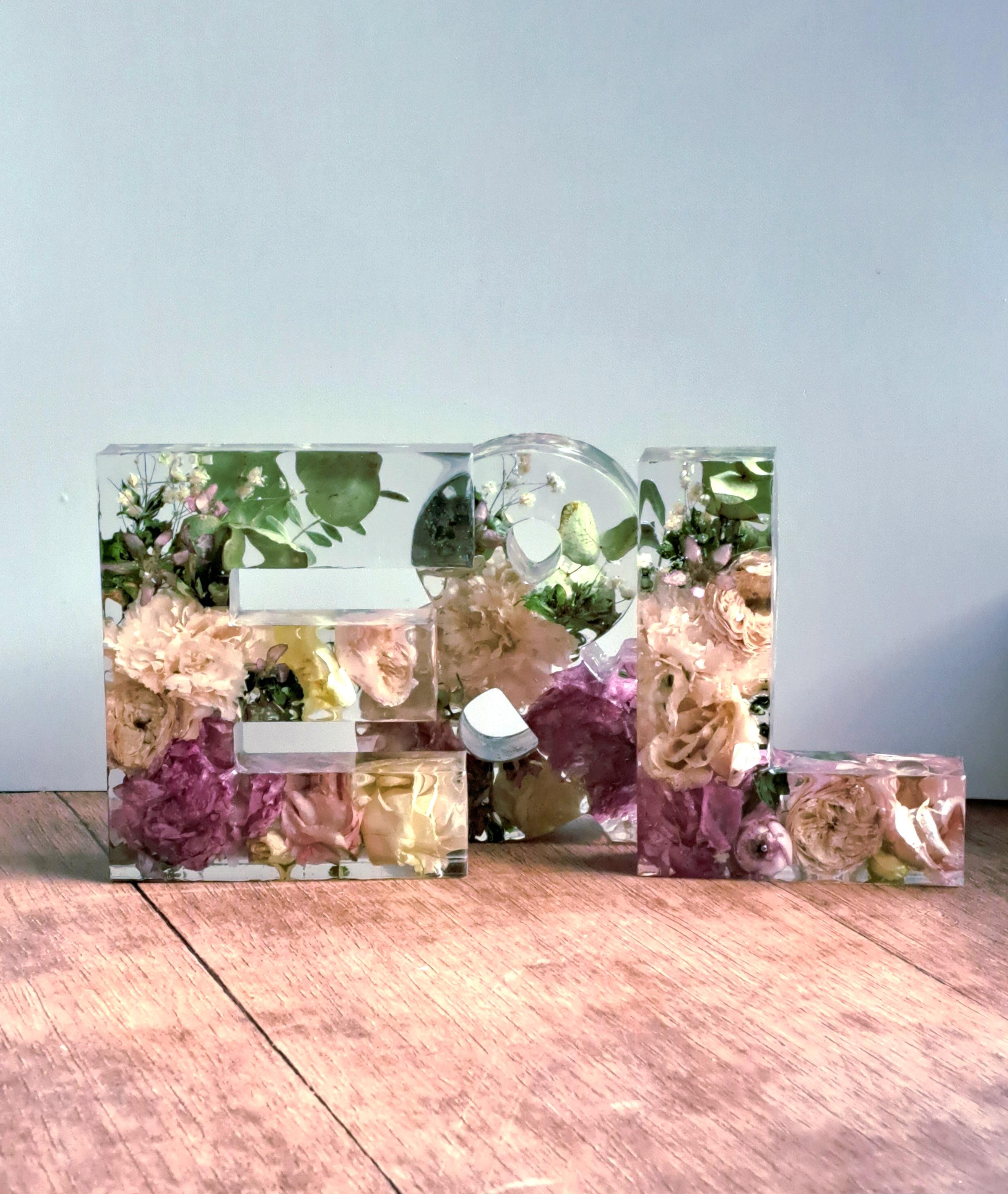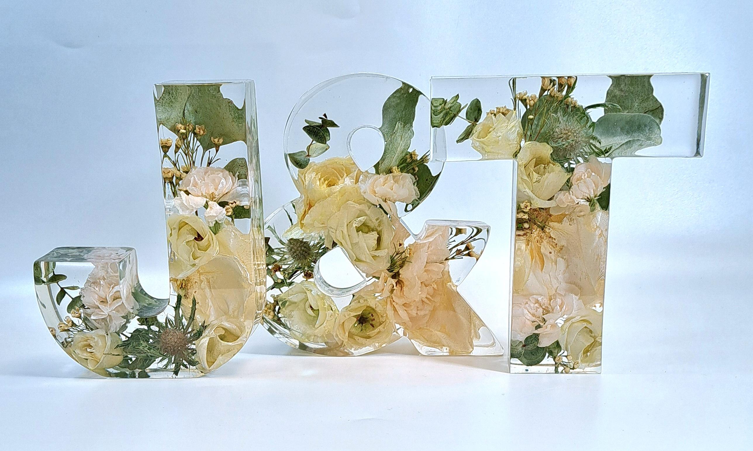 Buchstabe aus Epoxidharz mit eingearbeiteten, getrockneten Blumen aus dem eigenen Brautstrauß. Die Buchstaben sind ca. 15 cm hoch und ca. 3,5 cm tief. Die Breite variiert je nach Buchstabe. Beim Kauf von 2 Stück ist das &-Zeichen kostenfrei im gleichen Design dabei. Sollte dein Brautstrauß sehr große Blüten wie zum Beispiel Pfingstrosen, Nelken oder Callas enthalten, könnte es passieren, dass sie nach dem Trocknen von der Tiefe her nicht komplett in die Buchstaben passen. In dem Fall können wir sie nur auf der Seite liegend und / oder einzelne Blütenblätter mit einarbeiten. Bei vielen großen Blüten im Brautstrauß empfehlen wir die 5cm tiefen Buchstaben auszuwählen. Dauer bis zur Fertigstellung: ca. 5-6 Monate ab Eingang der Blumen bei uns.