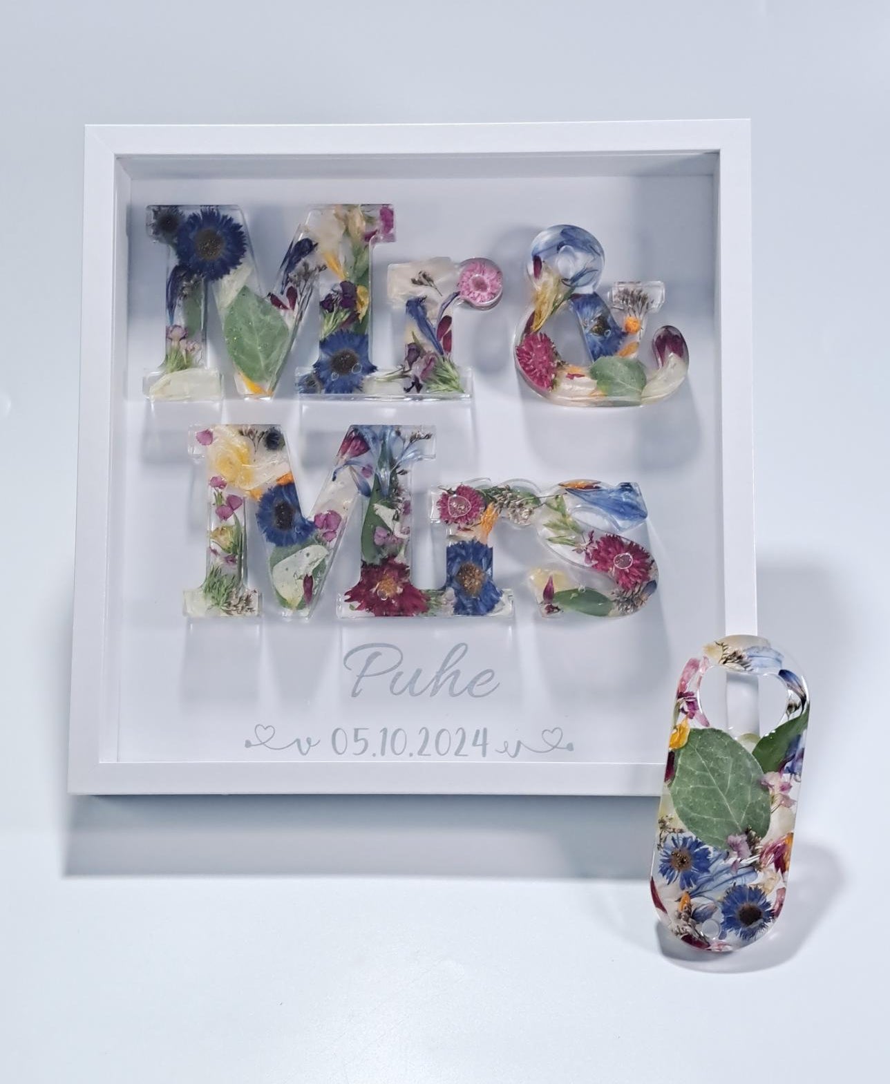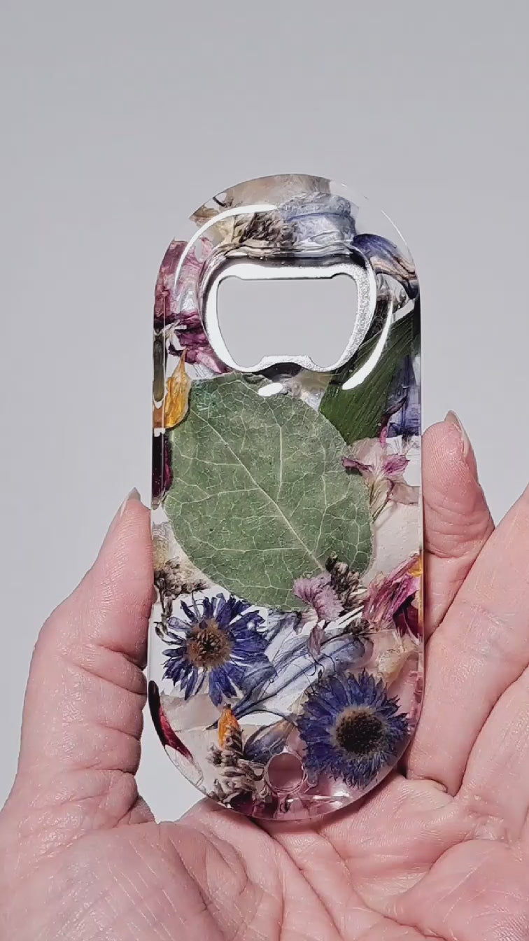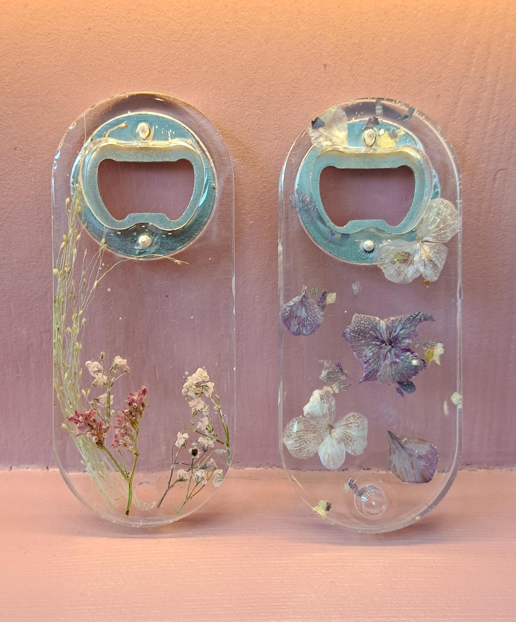 Flaschenöffner aus Epoxidharz mit eingearbeiteten, getrockneten Blüten aus dem eigenen Brautstrauß. Da in die Form nur wenige, kleine Blüten passen, kann er nur als Add-On gebucht werden. Dauer bis zur Fertigstellung: ca. 5-6 Monate ab Eingang der Blumen bei uns.
