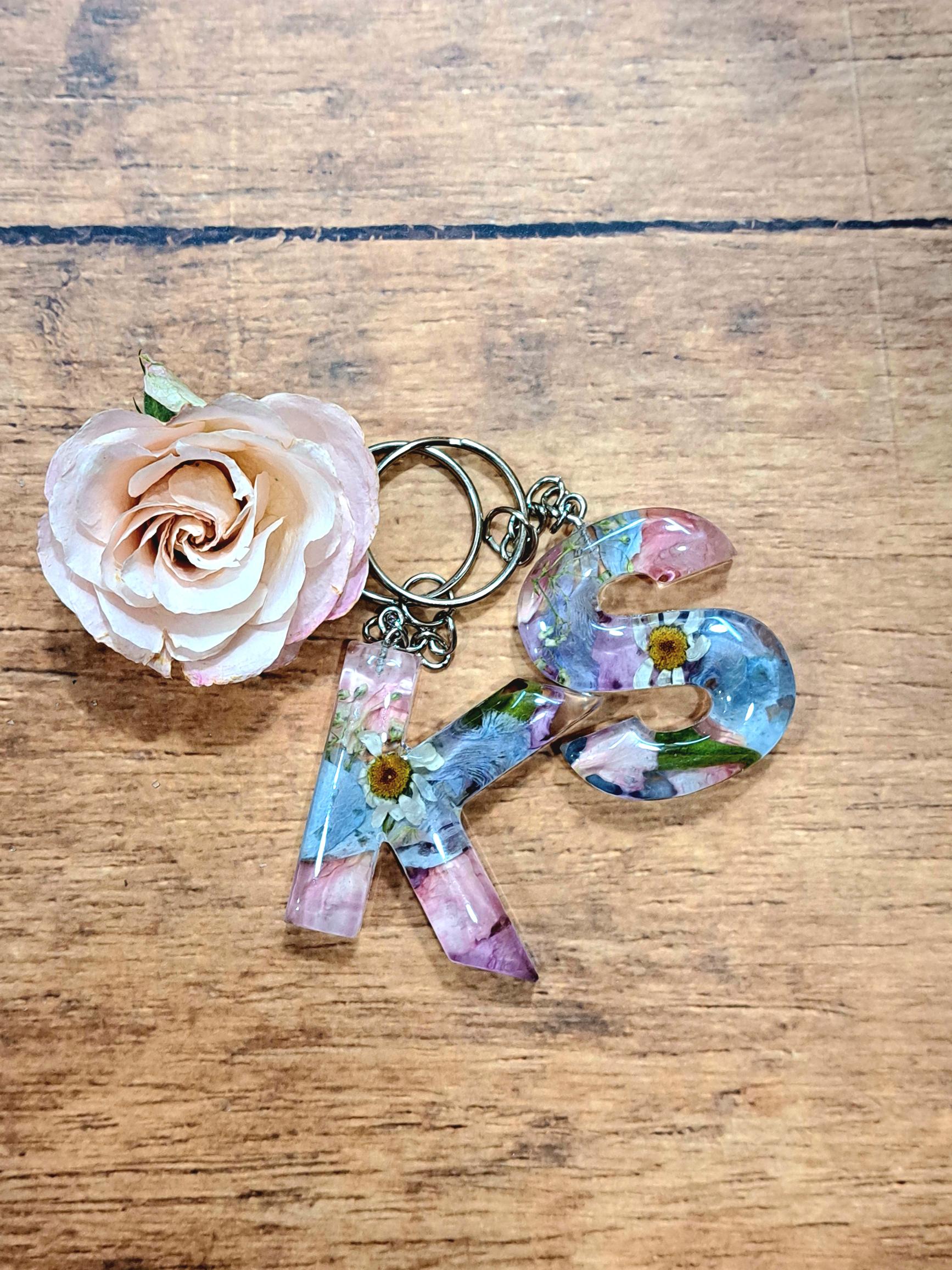 2 Stück Schlüsselanhänger aus Epoxidharz mit eingearbeiteten, getrockneten Blüten aus dem eigenen Brautstrauß. Du kannst zwischen Herzform und Buchstaben wählen. Da in die Form nur wenige, kleine Blüten passen, kann er nur als Add-On gebucht werden. Dauer bis zur Fertigstellung: ca. 5-6 Monate ab Eingang der Blumen bei uns.