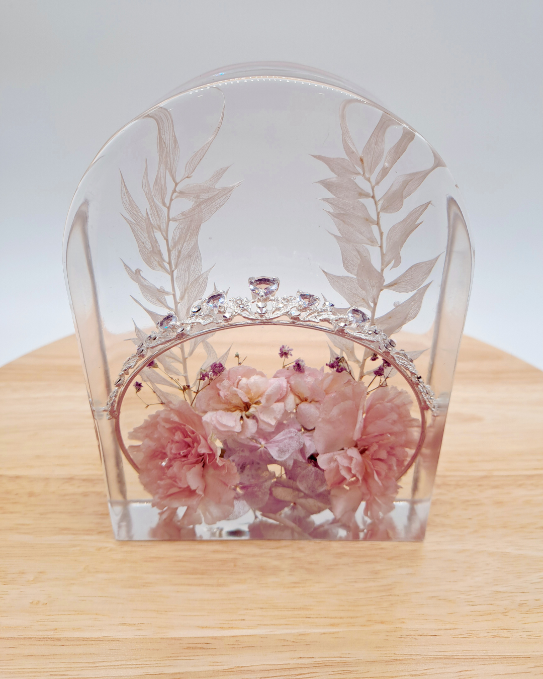 Aufsteller in Bogenform aus Epoxidharz mit eingearbeiteten, getrockneten Blumen aus dem eigenen Brautstrauß. Abmessungen ca. 12 x 17 cm