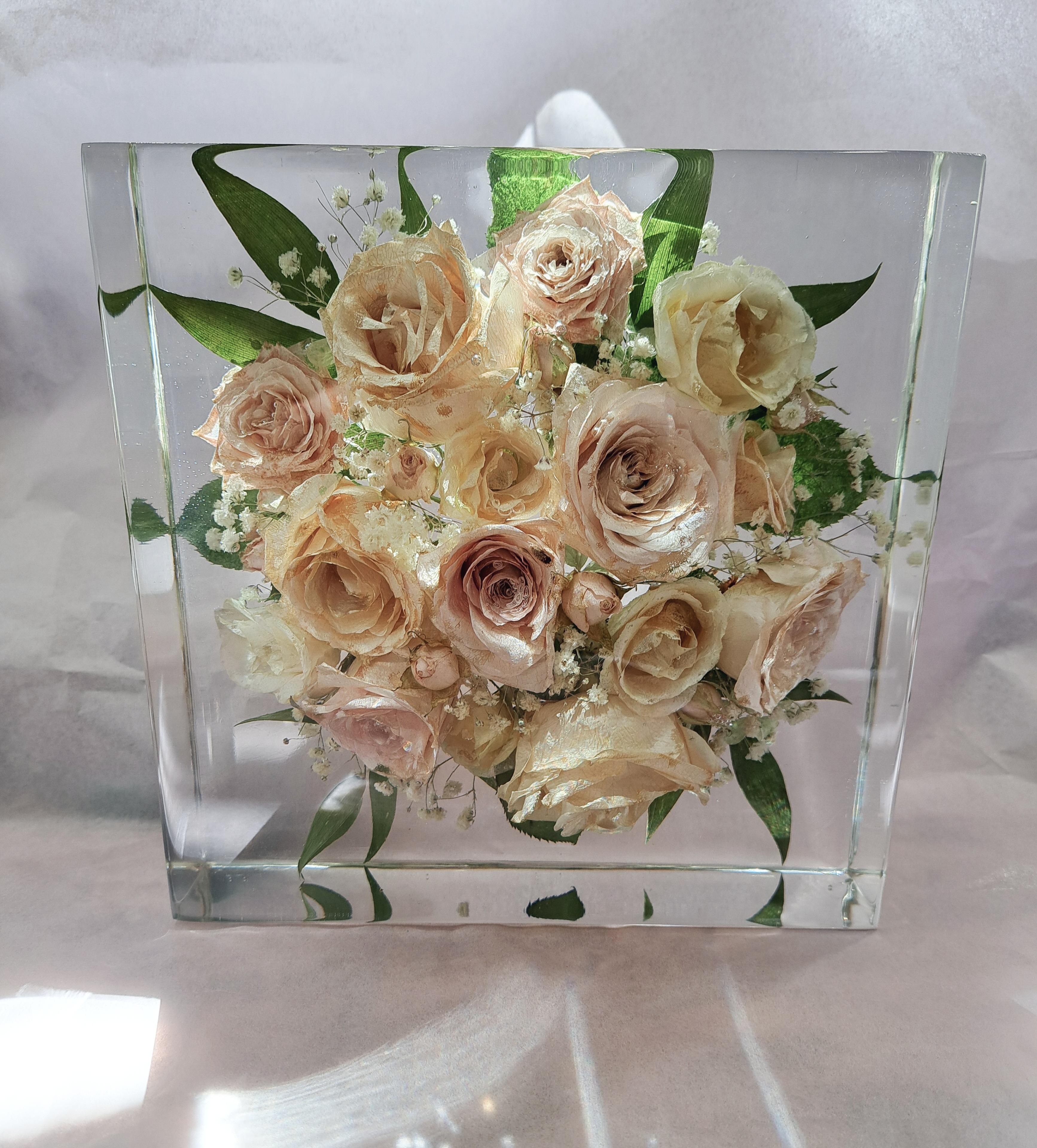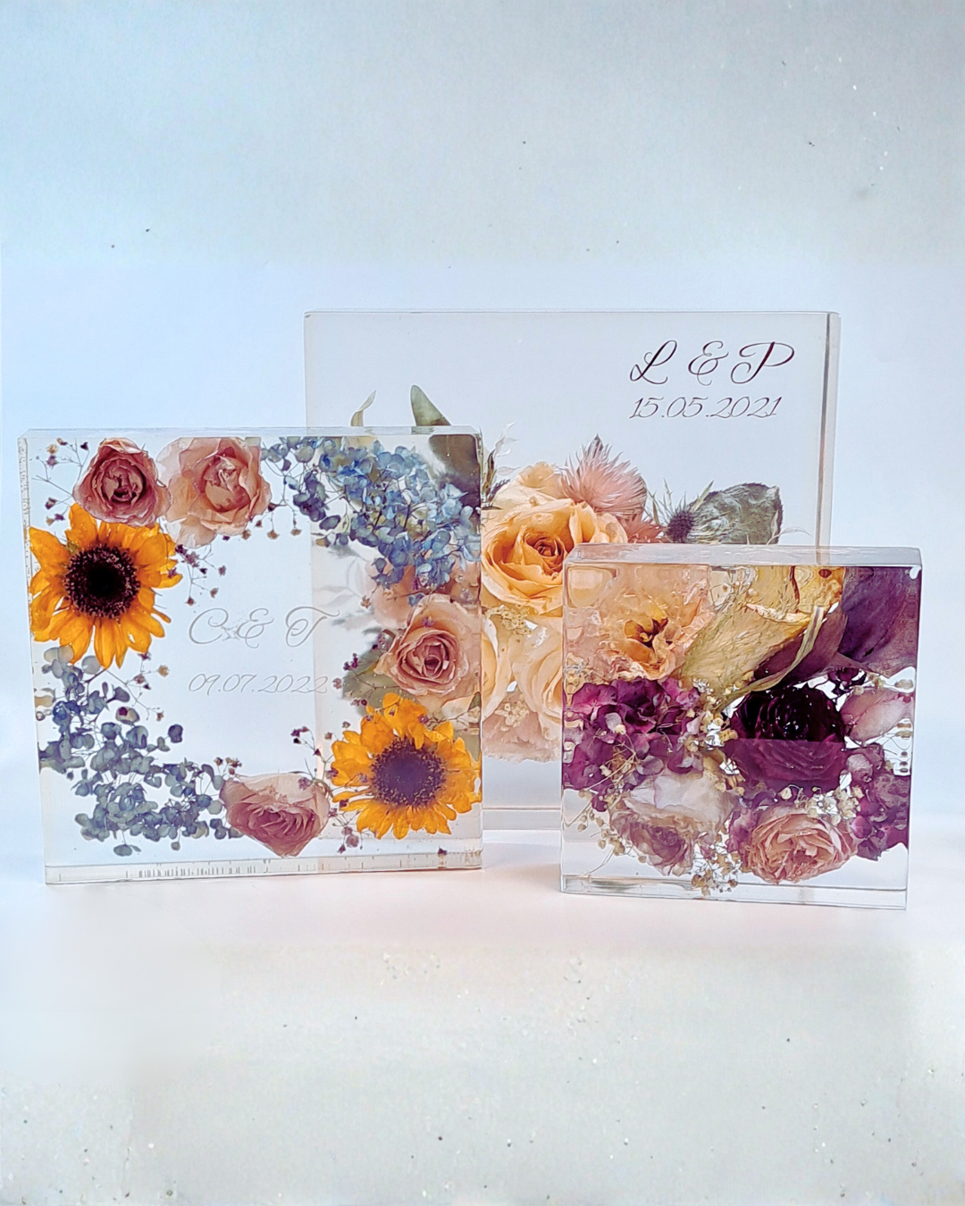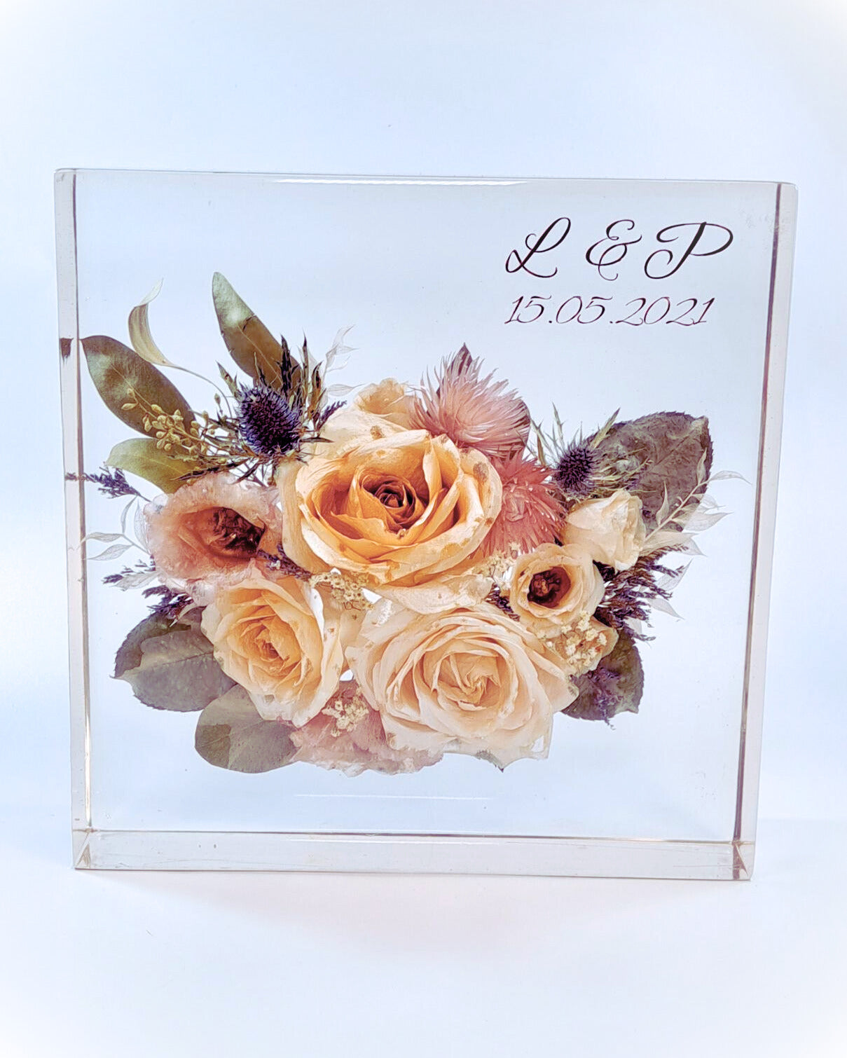 Aufsteller aus Epoxidharz in der Größe L mit eingearbeiteten, getrockneten Blumen aus dem eigenen Brautstrauß. Hochwertig verarbeitet und individuell gestaltet. Dauer bis zur Fertigstellung: ca. 5-6 Monate ab Eingang der Blumen bei uns.
